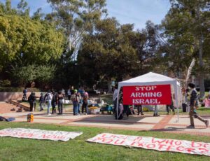 Demonstrators participate in the Gaza solidarity Sukkah in Dickson Court Monday. Jewish Voice for Peace at UCLA and Graduate Students for Justice in Palestine at UCLA erected the sukkah – a temporary structure used to celebrate the weeklong Jewish harvest holiday of Sukkot – around 8:45 a.m. (Michael Gallagher/Assistant Photo editor)