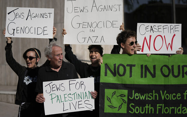 Illustrative: Members of the South Florida branch of anti-Zionist group Jewish Voice for Peace and other protesters call for a ceasefire in Gaza, outside the Miami office of Sen. Rick Scott, October 17, 2023, in Coral Gables, Florida. (AP Photo/Rebecca Blackwell)