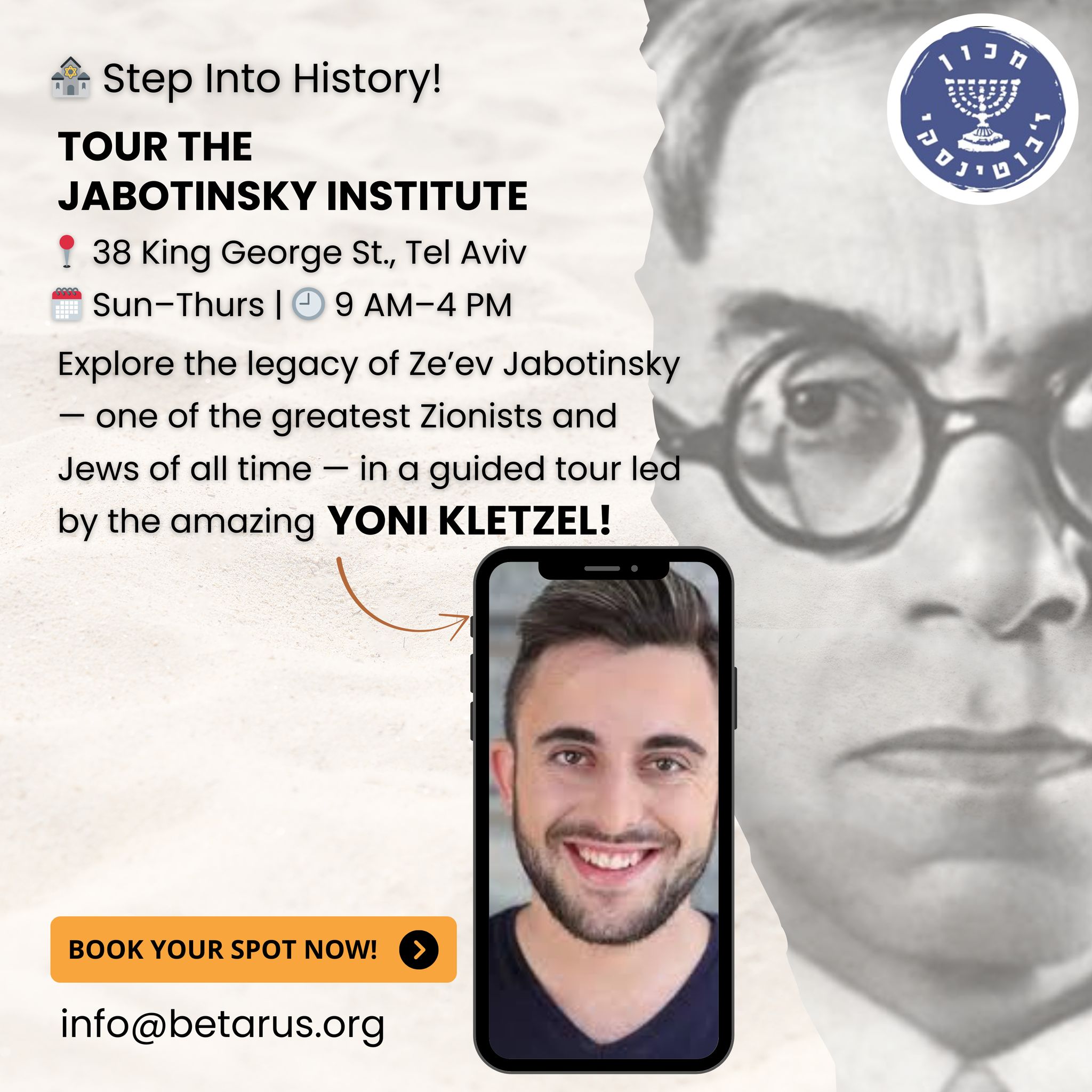 Tour the Jabotinsky Institute and explore the life and legacy of Ze’ev Jabotinsky—one of the most influential Zionist leaders in history. This guided tour takes you through rare archives, photographs, and historical documents that shaped the modern Jewish state. Learn about the Zionist movement, Jewish leadership, and the history of Betar through immersive exhibits and stories. Perfect for anyone interested in Israel’s founding history and Jewish heritage.